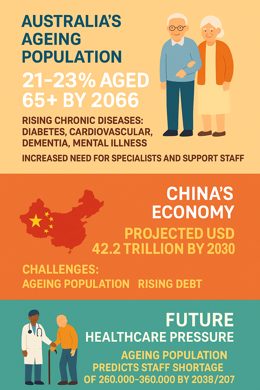global population ageing; economic growth shifts; healthcare workforce shortage; demographic transition; health technology innovation; pension system reform; intergenerational workforce