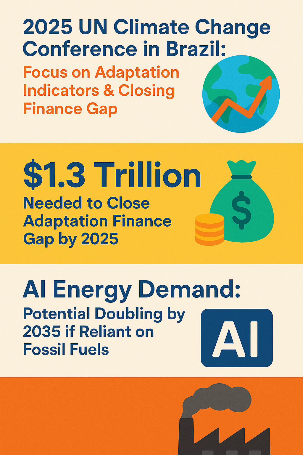 Finally, the 2025 UN Climate Change Conference (COP30) emphasizes adaptation finance to close a projected $1.3 trillion funding gap, potentially catalyzing greater AI uptake in climate resilience efforts—particularly in vulnerable developing economies (Hindustan Times 2025).