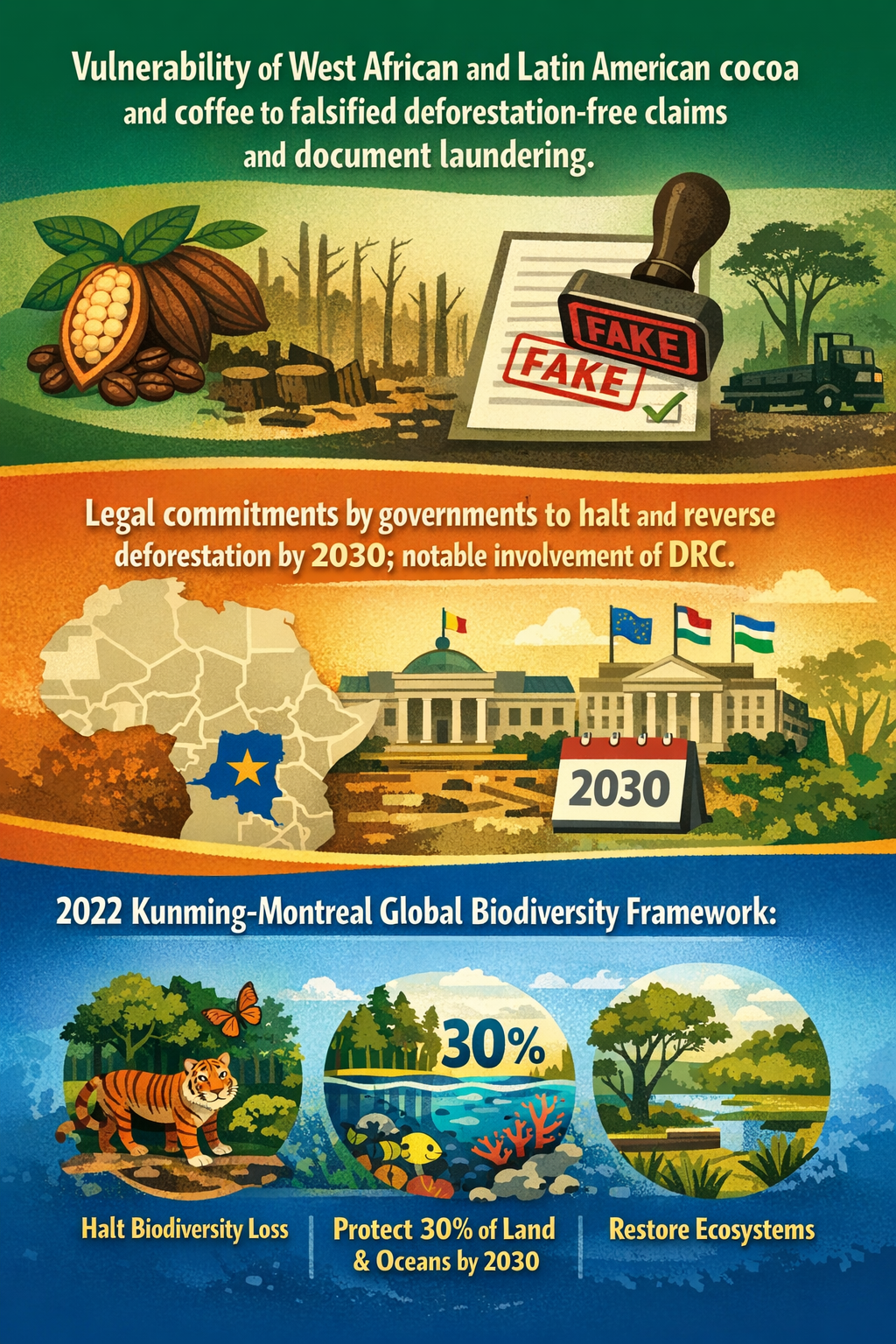 While international frameworks like the Kunming-Montreal Global Biodiversity Framework have galvanised commitments to halt biodiversity loss by 2030, an under-acknowledged weak signal is the rapid digital evolution of ecosystem-related document laundering and fraud in commodity supply chains. This signal intersects with growing regulatory commitments to zero-deforestation, particularly in vulnerable sectors such as cocoa and coffee. If unchecked, these emerging fraud tactics could undermine systemic efforts to enforce biodiversity protections, leading to cascading regulatory, financial, and reputational shocks.
